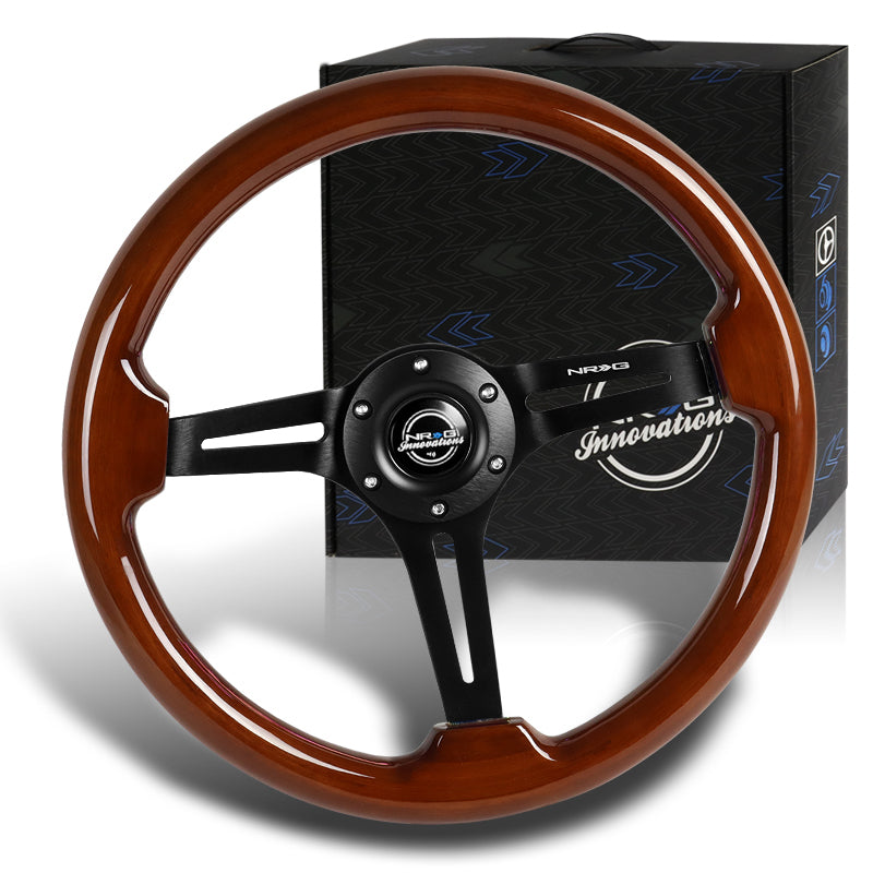 NRG 14" 350mm 6-Bolt Hole Brown Wood Grain Grip With Aluminum Finished 3-Spoke 3 Inch Deep Dish Steering Wheel RST-018BR-BK -Black Spoke