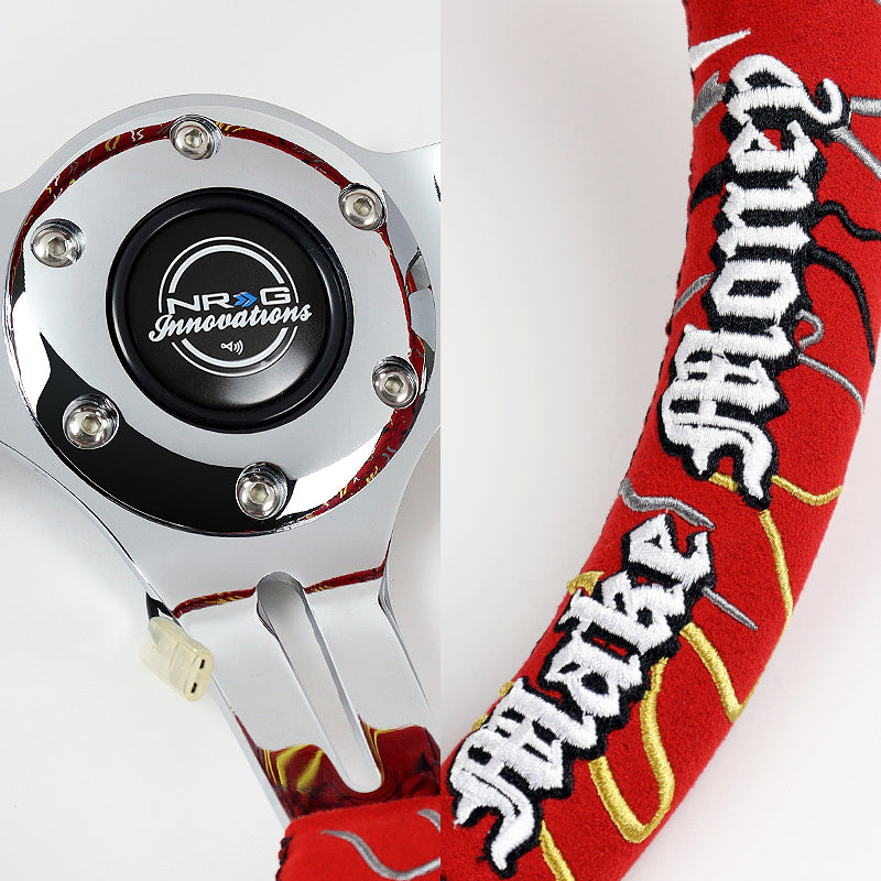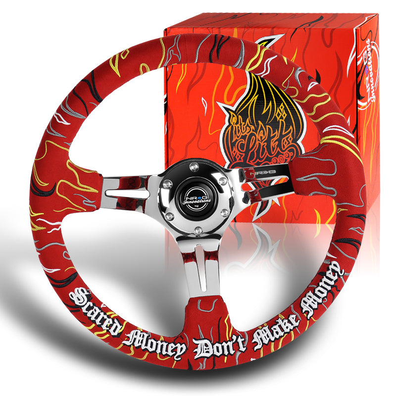 NRG 14" 350mm Ryan Litteral 6-Bolt Hole V3 Red Suede Grip With Aluminum Finished 3-Spoke 3 Inch Deep Dish Steering Wheel RST-018CH-RLR -Chrome Spoke