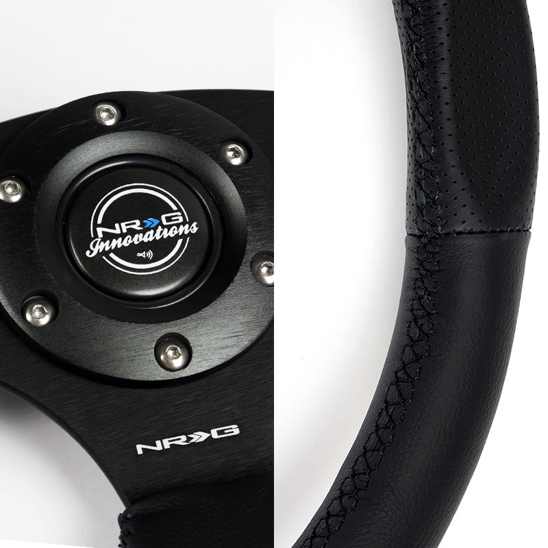 NRG Racing Style 14" 350mm 6-Bolt Hole Black Leather Grip With Aluminum Finished 3-Spoke Black Center Steering Wheel RST-009R -Black Stitch