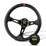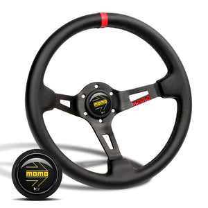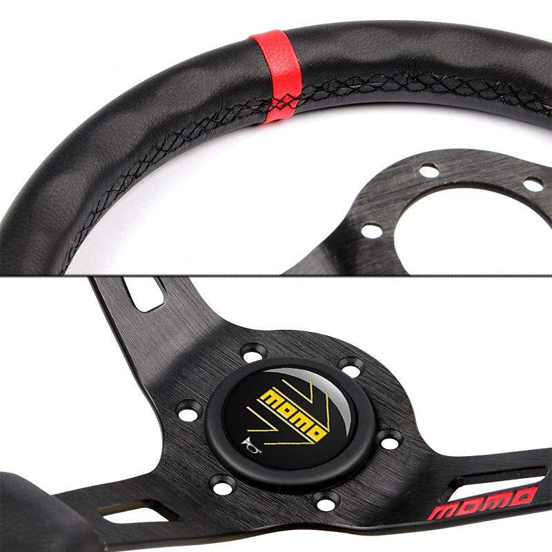 • Create an impression when passengers come on board your souped-up vehicle with this 350mm MOMO style steering wheel. Its Deep dished design complements its classy Black stitching. Made from genuine Microfiber leather and lightweight alloy for the spoke. It will no doubt create an impression!