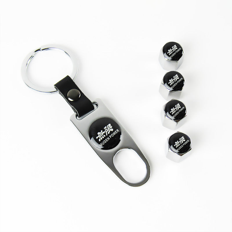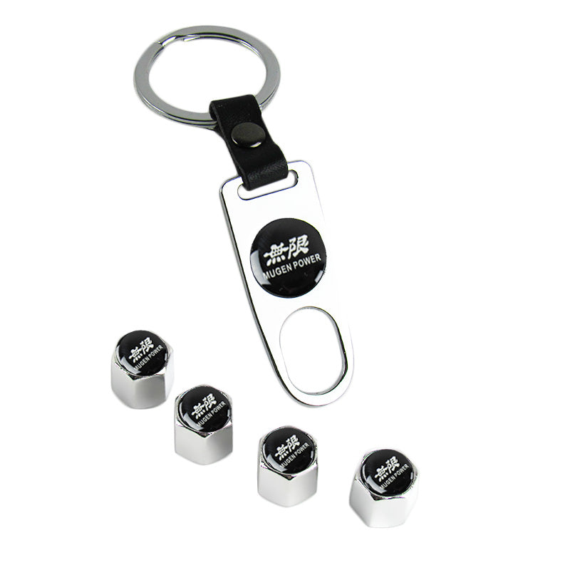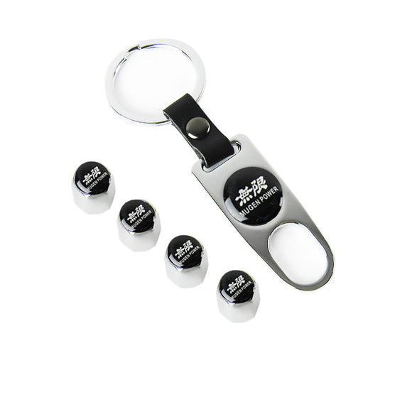 Silver Mugen Universal Car SUV Wheel Tire Valves Dust Stem Air Caps Keychain Emblem Set