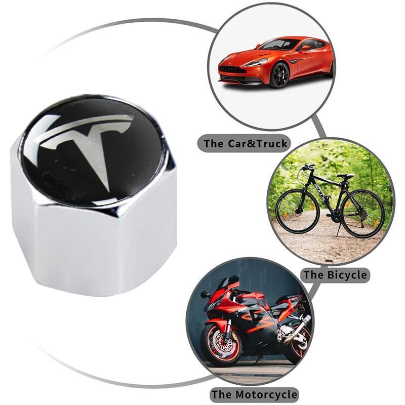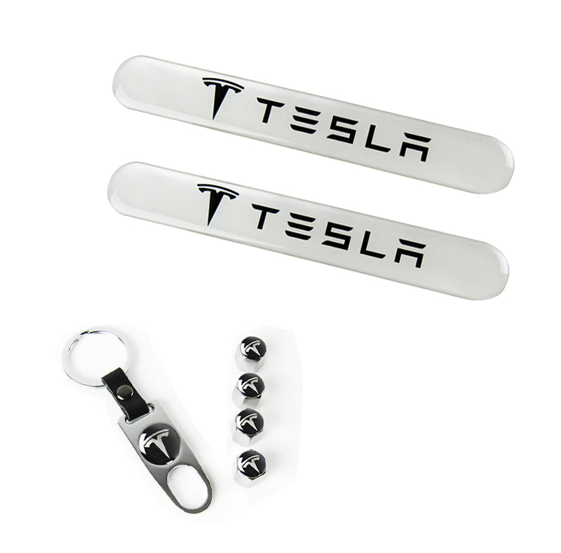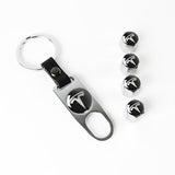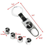 TESLA Set LOGO Emblems with Silver Keychain Tire Valves Wheel Air Caps - US SELLER