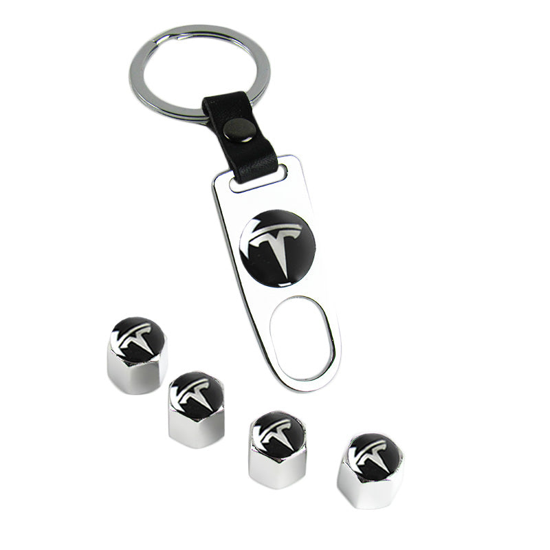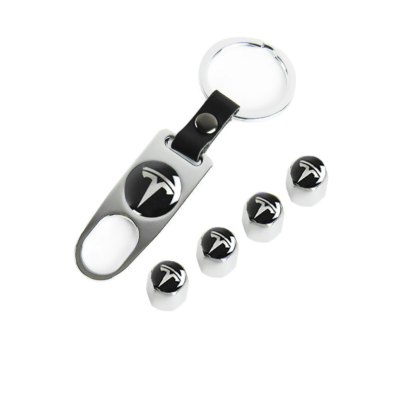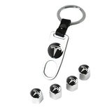 TESLA Universal Car SUV Wheel Tire Valves Dust Stem Air Caps Keychain Emblem Silver Set