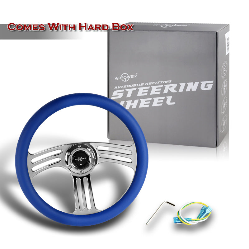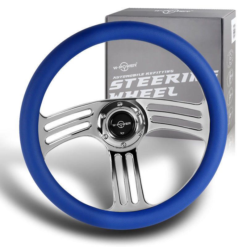W-Power 14" 350mm 6-Bolt Hole Vintage Style Blue Leather Grip With Aluminum Finished 3-Spoke 3 Inches Deep Dish Steering Wheel -Chrome Center Spoke
