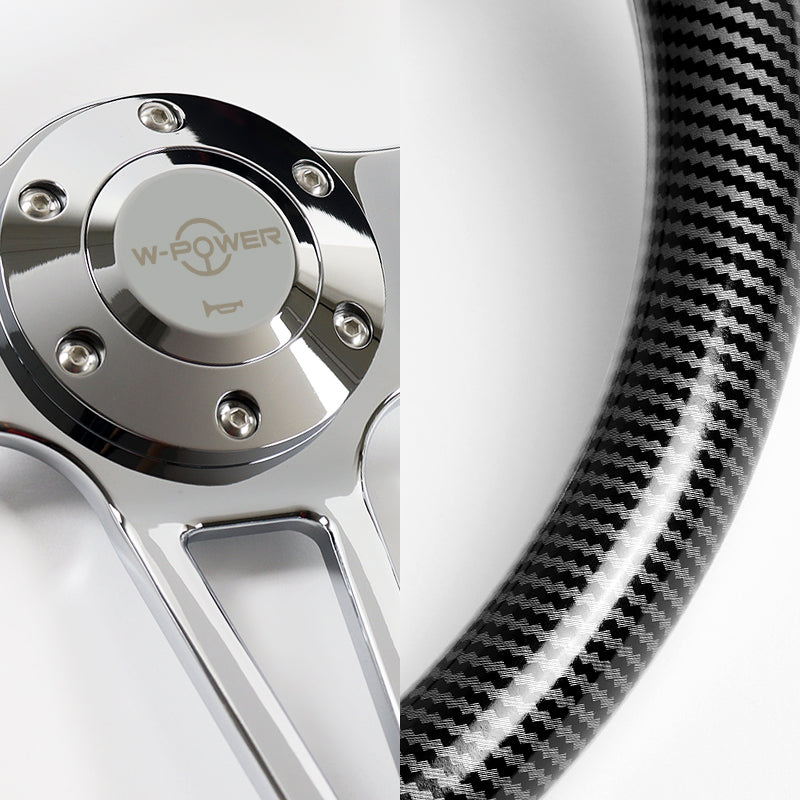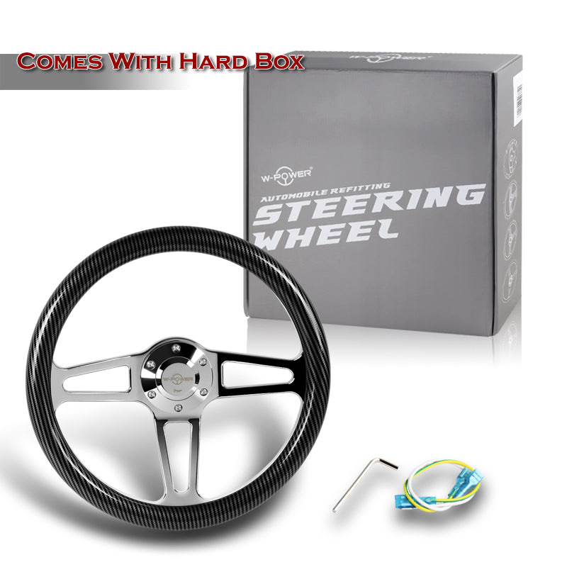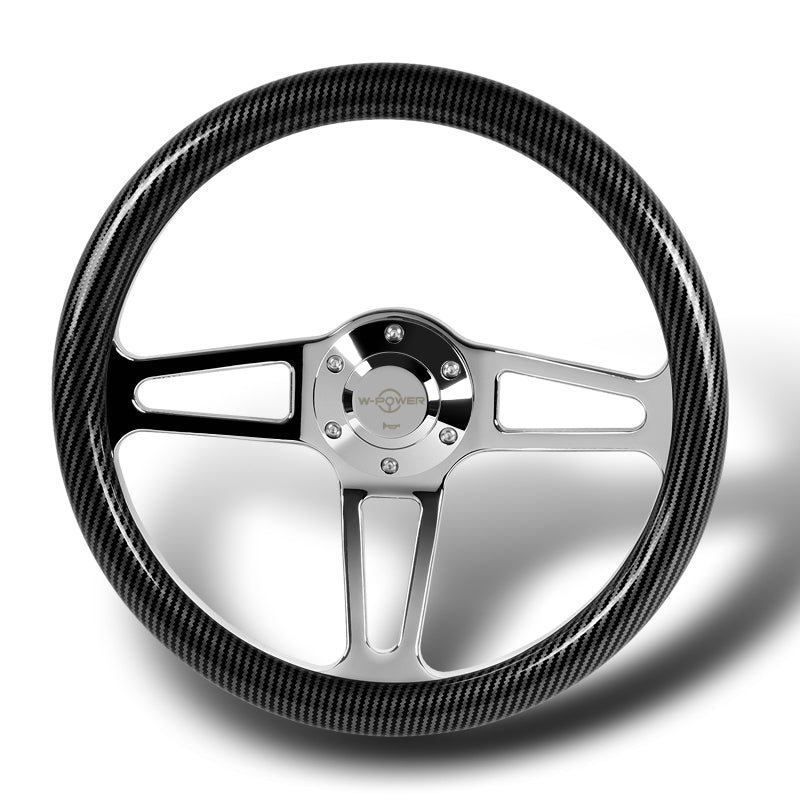 W-Power 14" 350mm 6-Bolt Hole Vintage Style Carbon Fiber Look Style Grain Grip With Aluminum Finished 3-Spoke Steering Wheel -Chrome Center Spoke