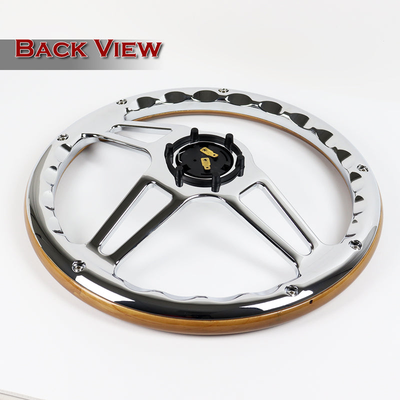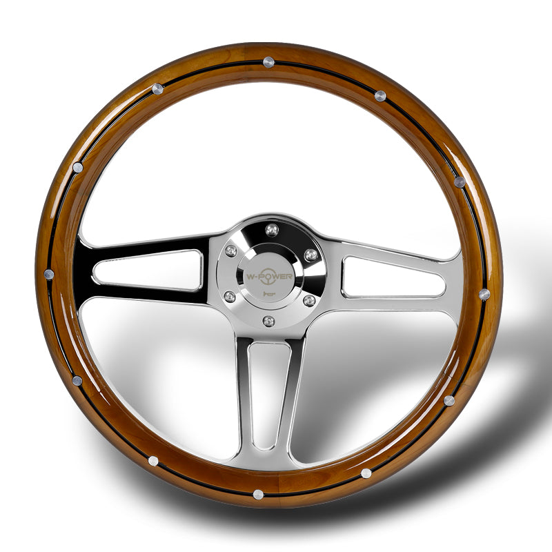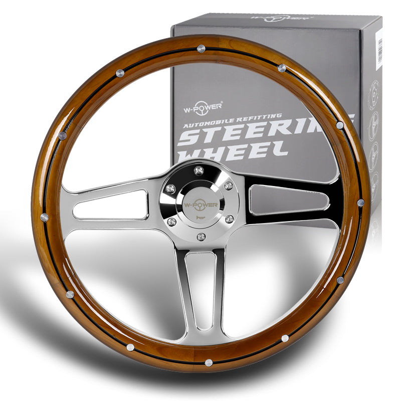W-Power 14" 350mm 6-Bolt Hole Vintage Style Classic Dark Wood Grip With Billet Stripe Aluminum Finished 3-Spoke Steering Wheel -Chrome Center Spoke