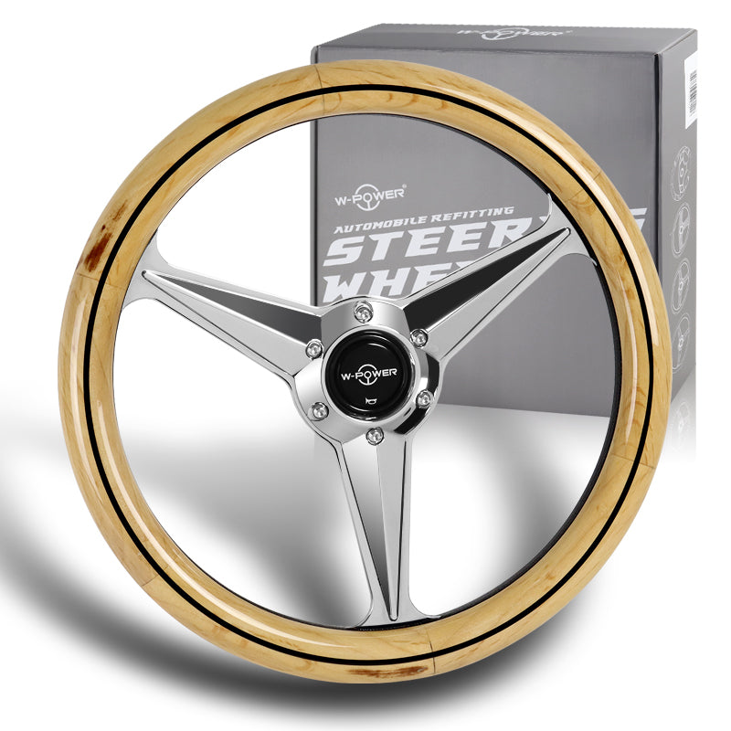 W-Power 14" 350mm 6-Bolt Hole Vintage Style Oak Wood With Black Line Grip Aluminum Finished 3-Spoke Steering Wheel