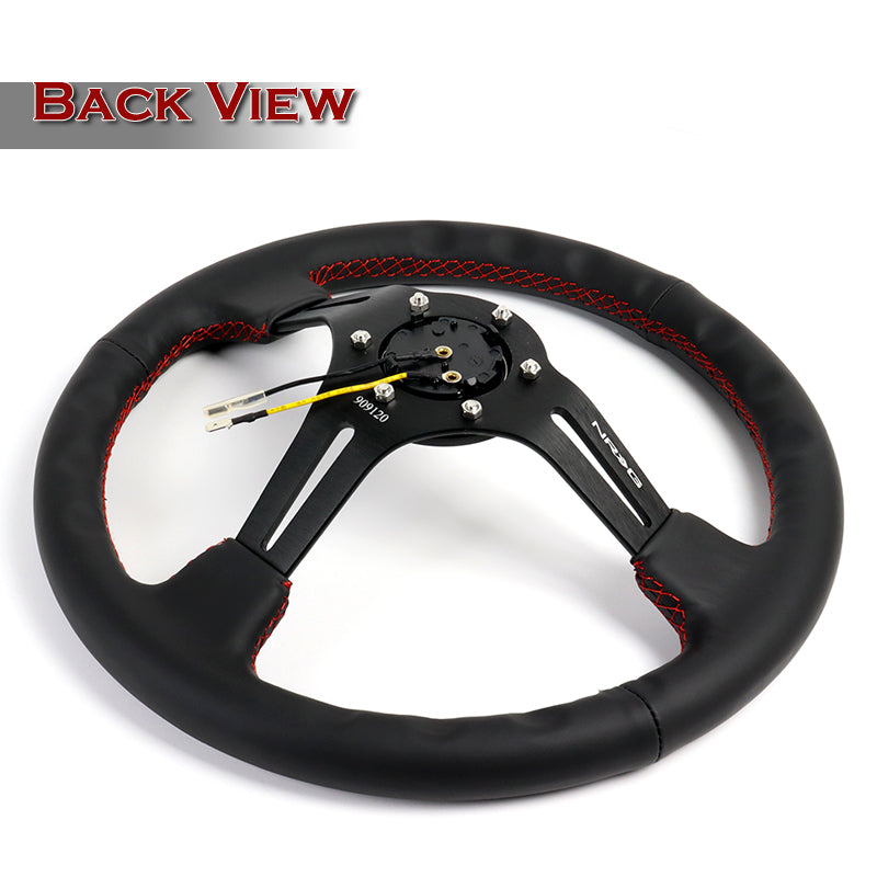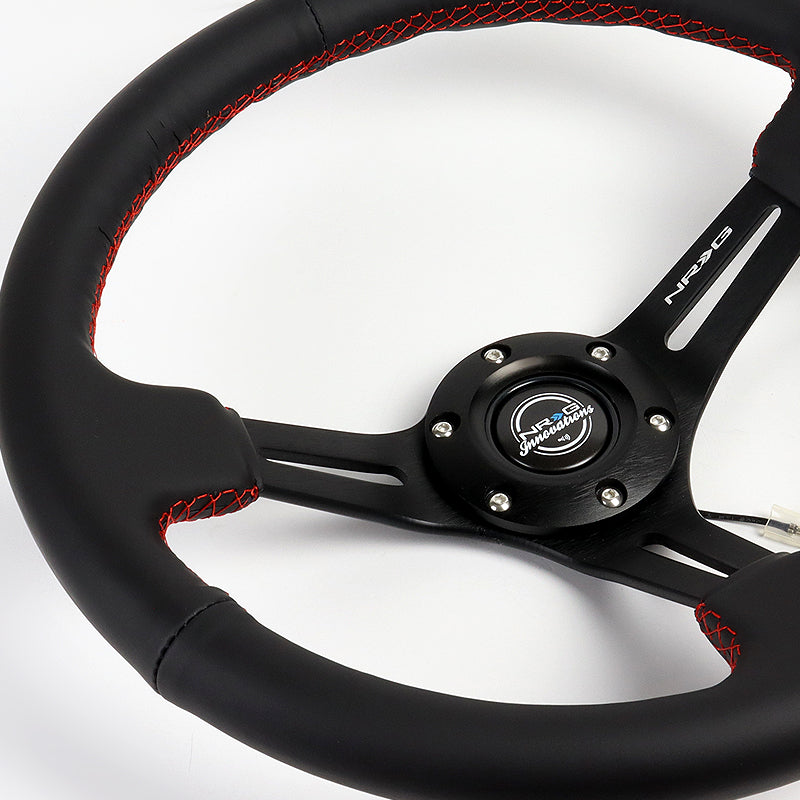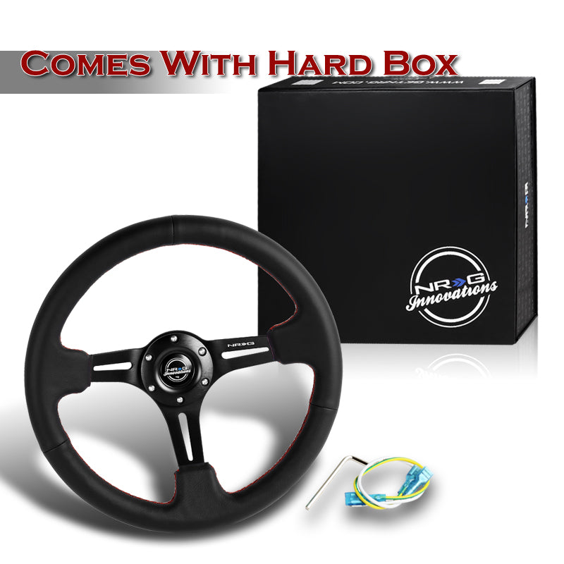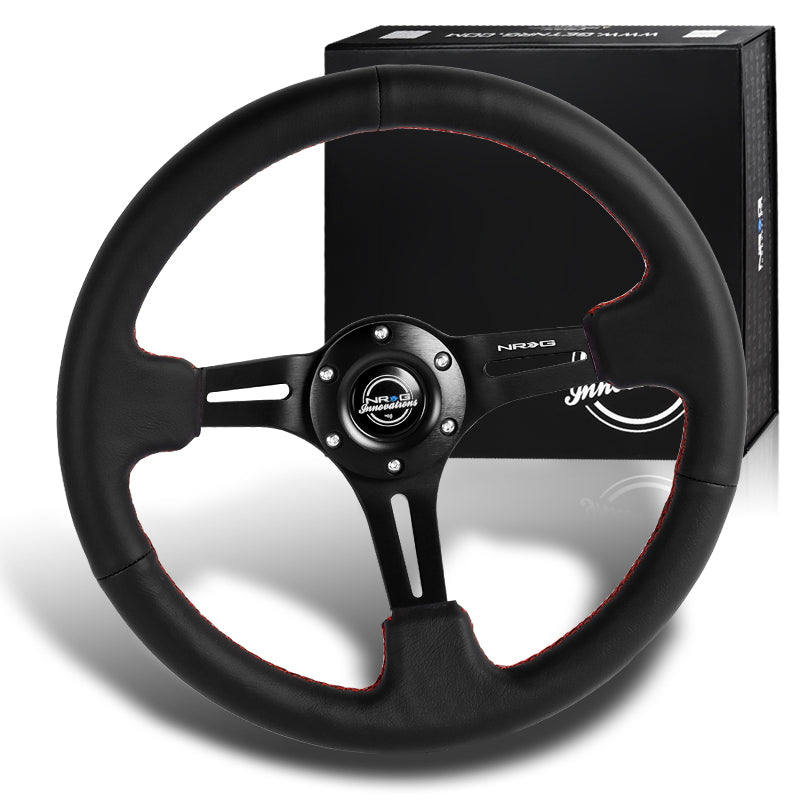 NRG 14" 350mm 6-Bolt Hole Black Leather Red Stitch Grip With Aluminum Finished 3-Spoke 3 Inch Deep Dish Steering Wheel RST-018R-RS -Black Spoke