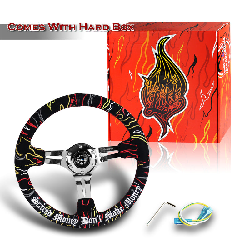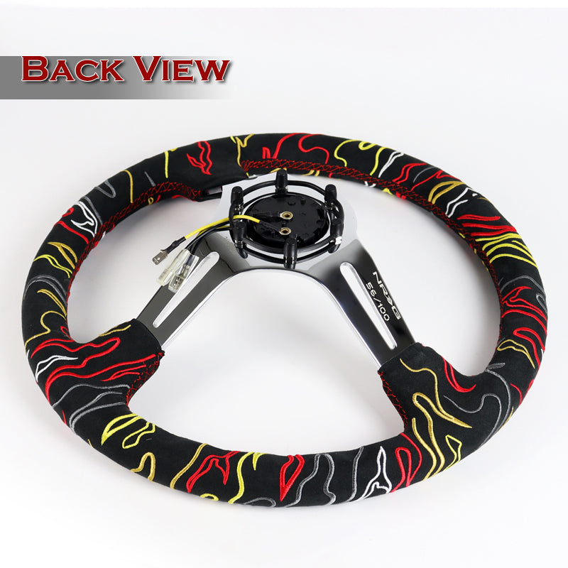 NRG 14" 350mm Ryan Litteral 6-Bolt Hole V3 Black Suede Grip With Aluminum Finished 3-Spoke 3 Inch Deep Dish Steering Wheel RST-018CH-RLB -Chrome Spoke