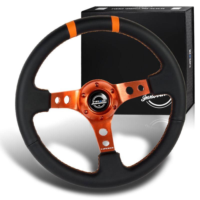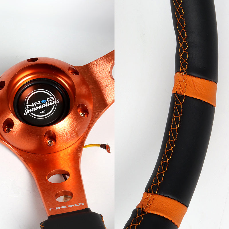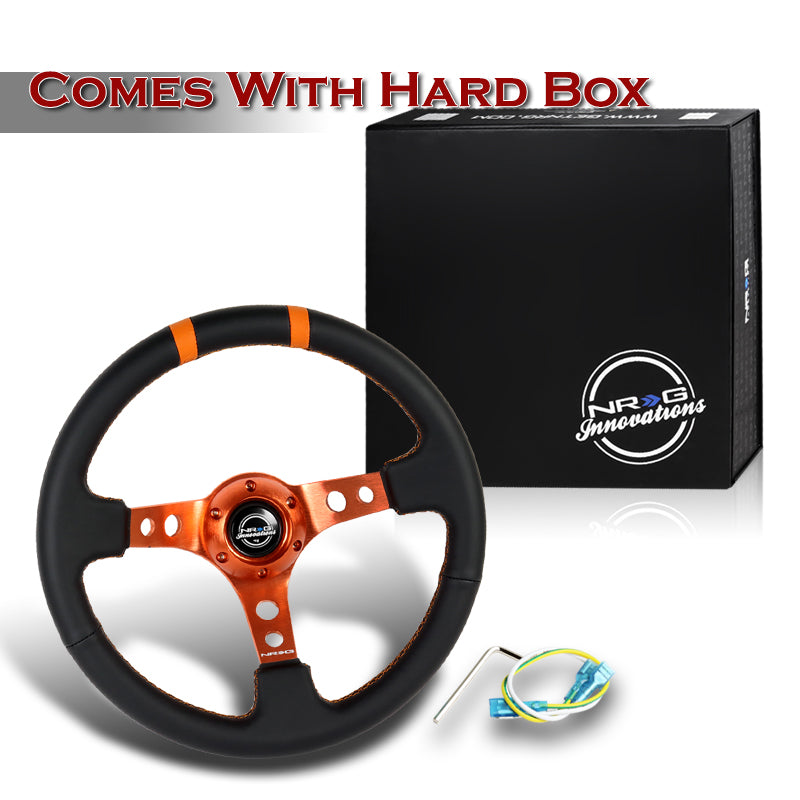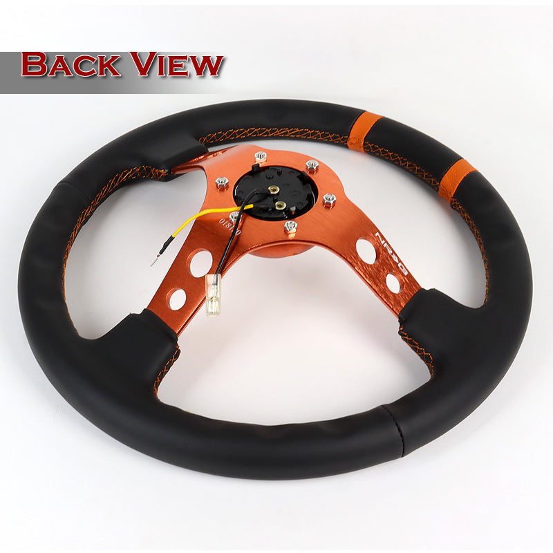 NRG Racing Style 13.75" 350mm 6-Bolt Hole Black Leather Grip With Aluminum Finished 3-Spoke 3 Inch Deep Dish Orange Center Steering Wheel RST-016R-OR -Orange Stitch