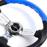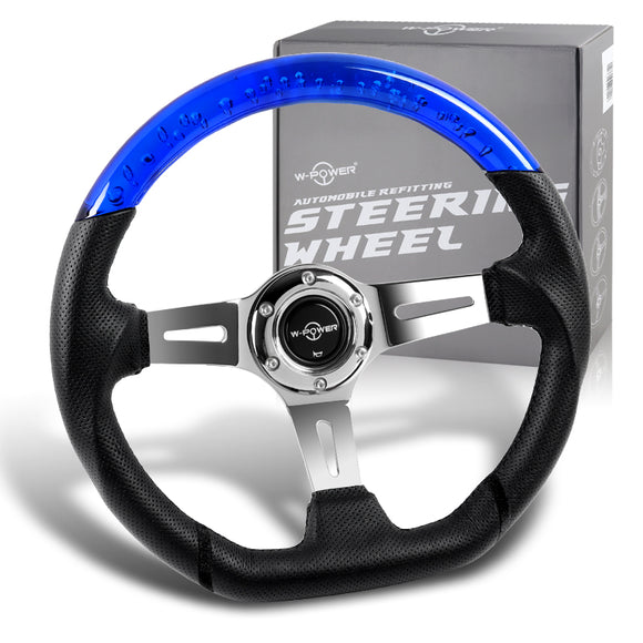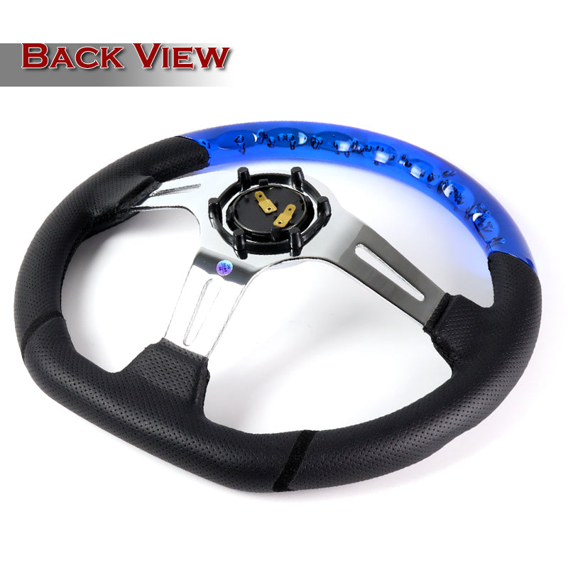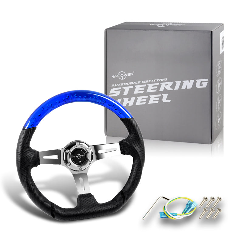 W-Power 13.5" 343mm 6-Bolt Hole JDM Euro VIP Style Blue Crystal Bubble With Black Leather Grip Aluminum Finished 3-Spoke 3 Inch Deep Dish Steering Wheel