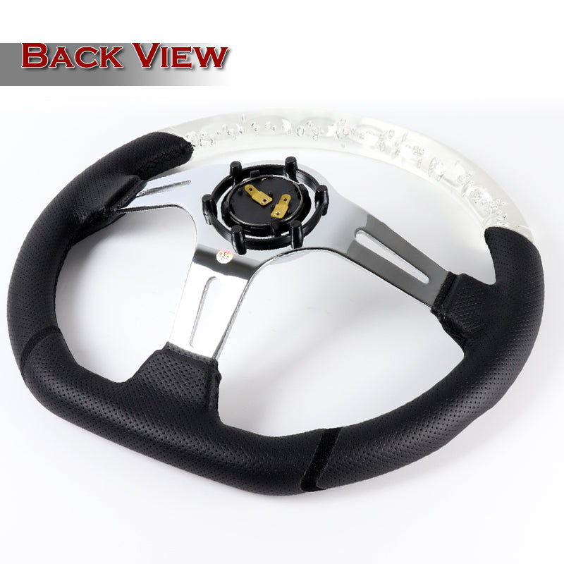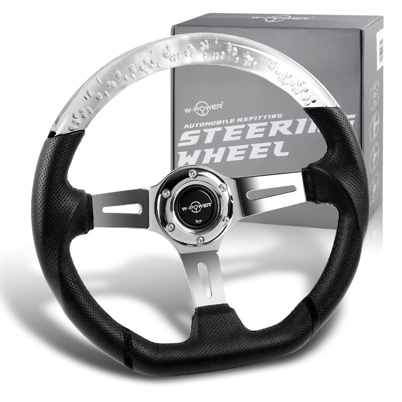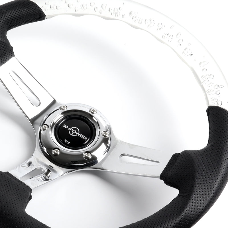 W-Power 13.5" 343mm 6-Bolt Hole JDM Euro VIP Style Clear Crystal Bubble With Black Leather Grip Aluminum Finished 3-Spoke 3 Inch Deep Dish Steering Wheel