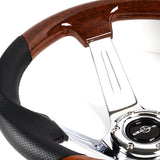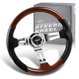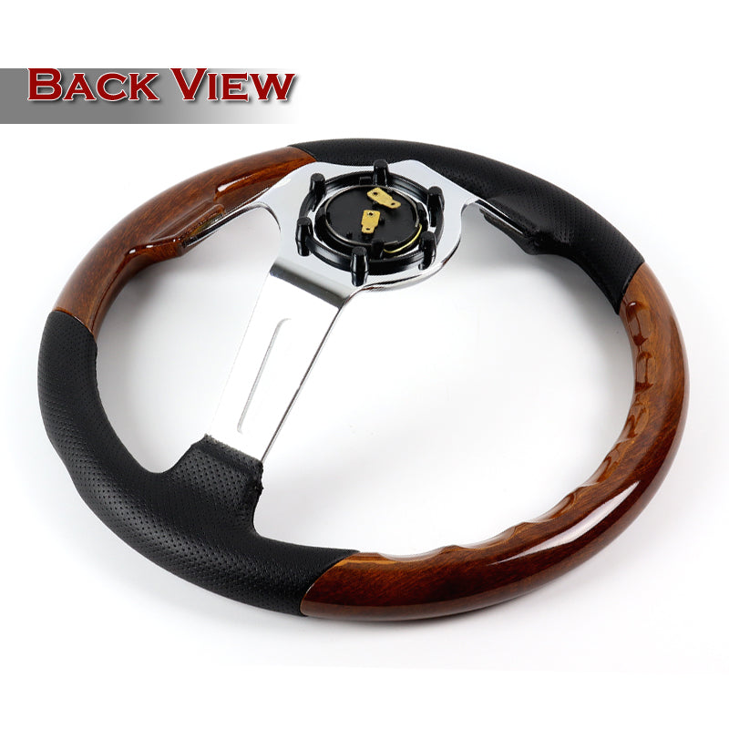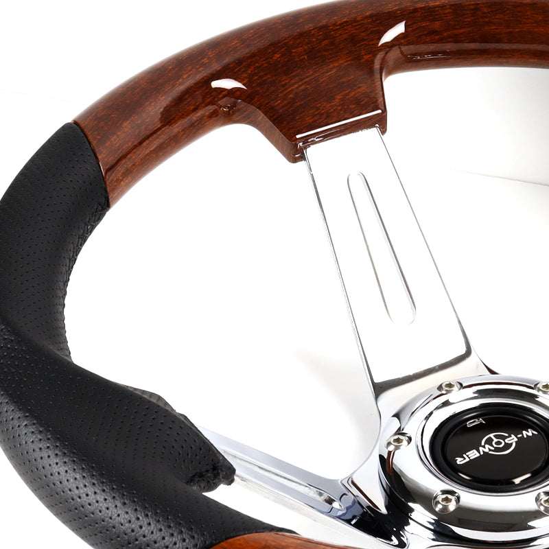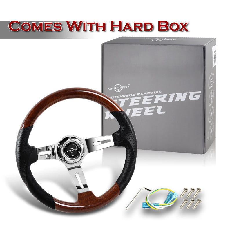 W-Power 13.5" 343mm 6-Bolt Hole JDM Euro VIP Style Dark Wood Black Leather Grip With Aluminum Finished 3-Spoke 4 Inch Deep Dish Steering Wheel