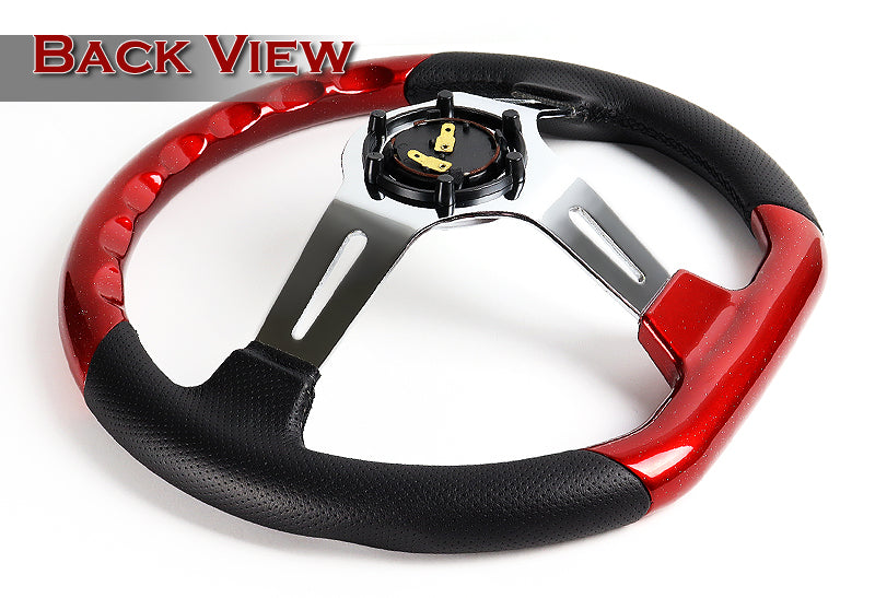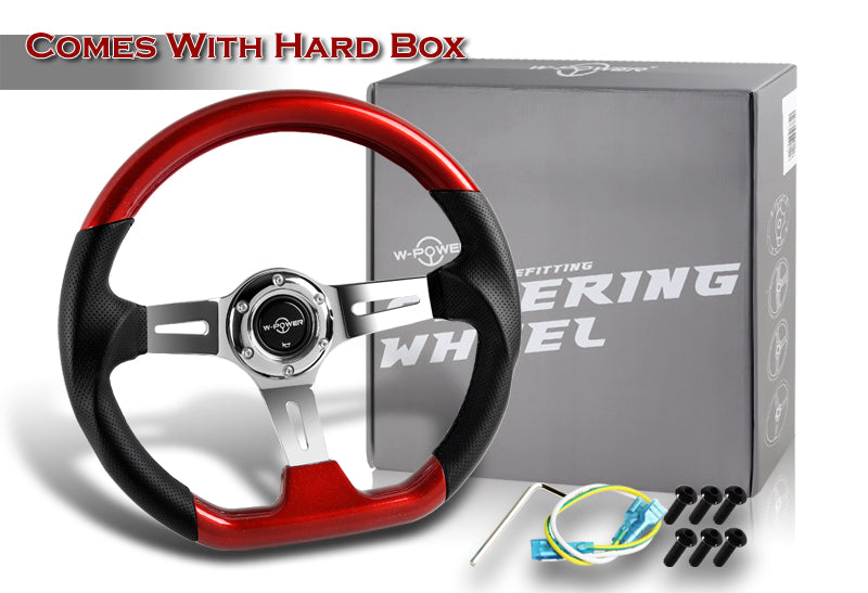 W-Power 13.5" 343mm 6-Bolt Hole JDM Euro VIP Style Pearl Wood Black Leather Grip With Aluminum Finished 3-Spoke 3 Inch Deep Dish Steering Wheel -Pearl Red Wood