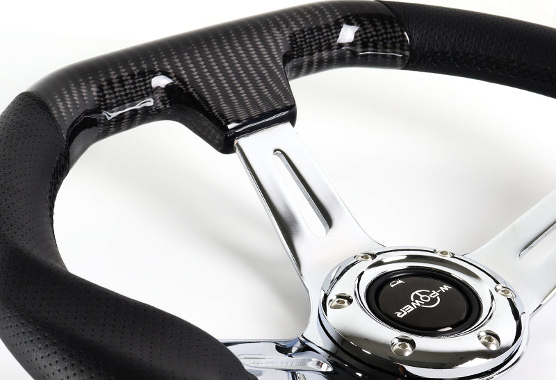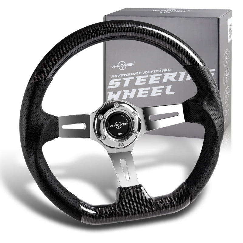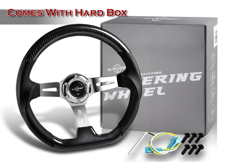 W-Power 13.5" 343mm 6-Bolt Hole JDM Euro VIP Style Real Carbon Fiber Black Leather Grip Aluminum Finished 3-Spoke 3 Inch Deep Dish Steering Wheel