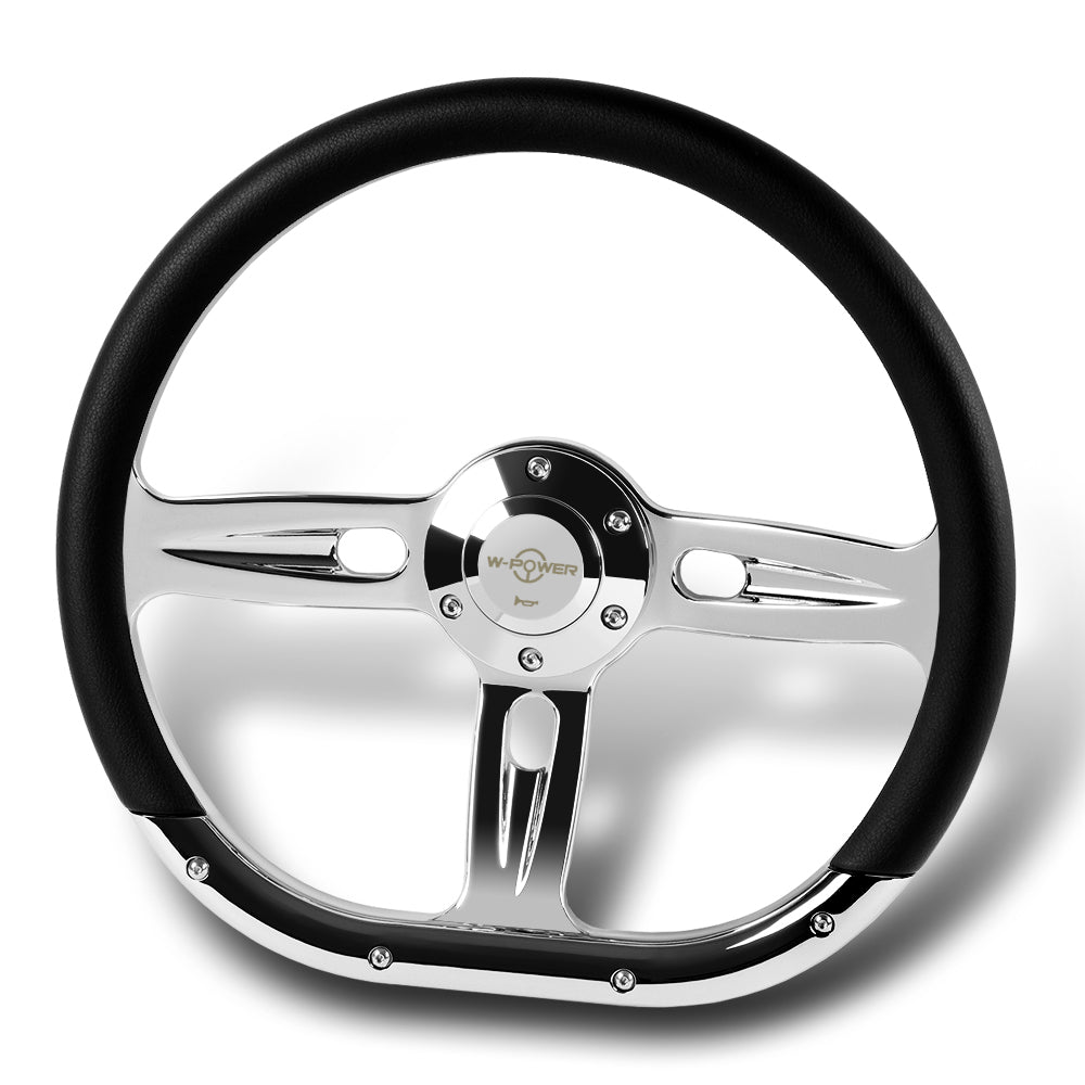 W-Power 14" 350mm 6-Bolt Hole Vinyl Grip With Aluminum Finished 3-Spoke Steering Wheel -Black Vinyl Wrap/Chrome Center Spoke