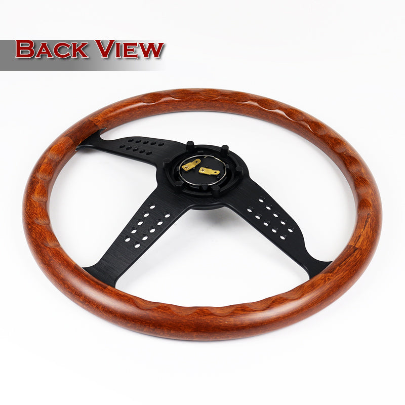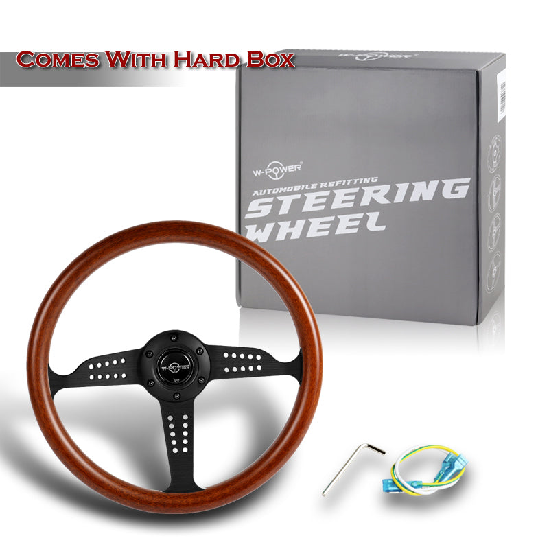 W-Power 14" 350mm 6-Bolt Hole Classic Style Dark Wood Mahogany Grain Grip With Aluminum Finished 3-Spoke Steering Wheel -Black Center Spoke