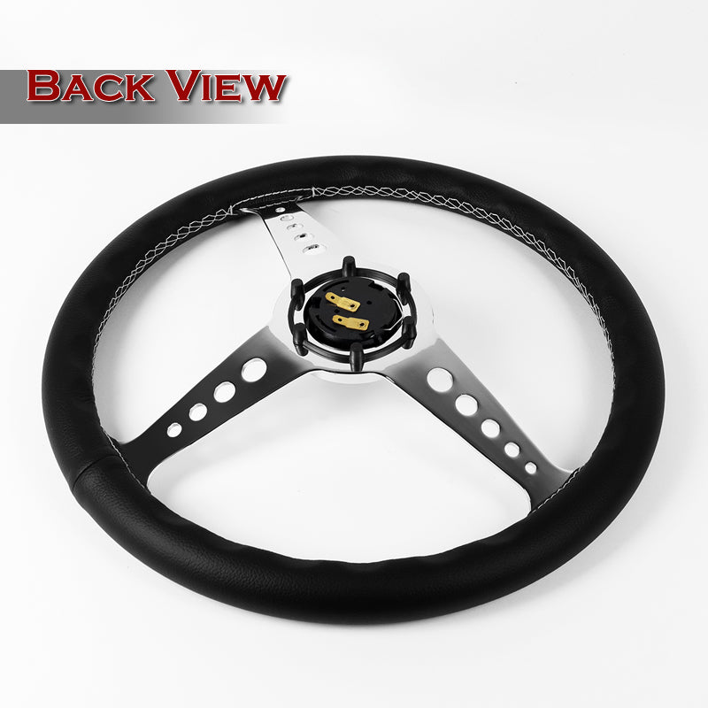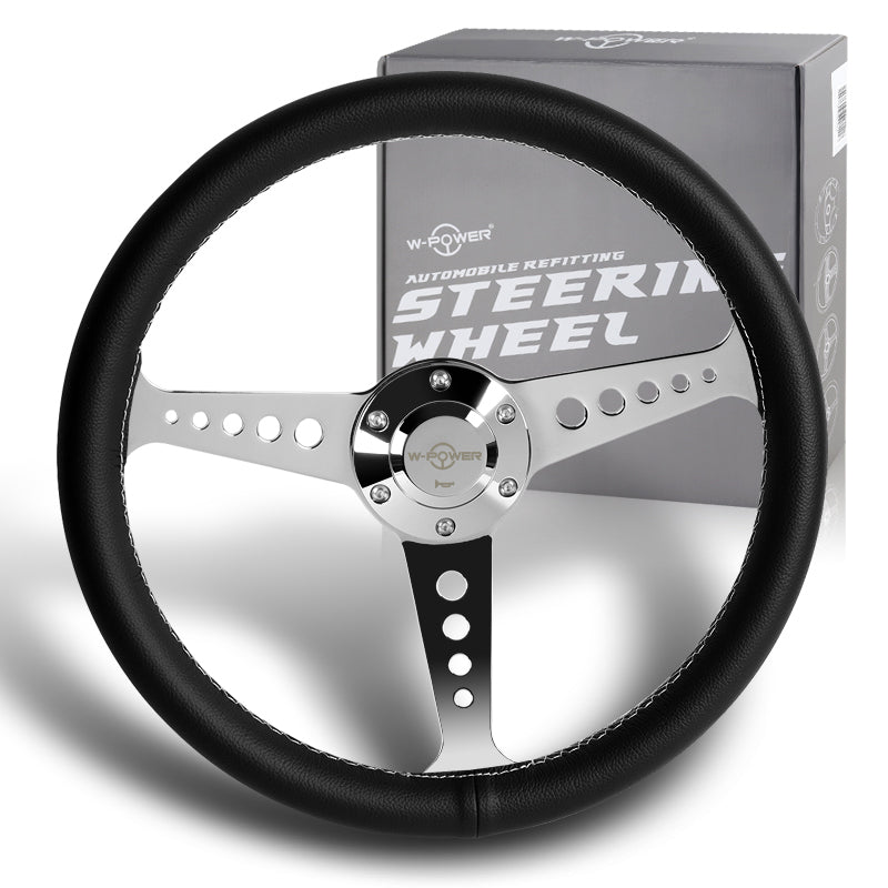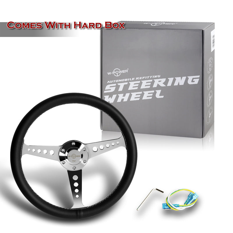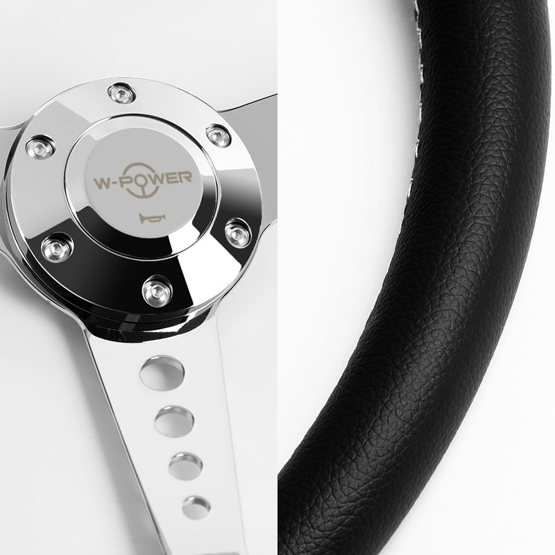 W-Power 14" 350mm 6-Bolt Hole JDM Euro VIP Style Galaxy Black Leather White Stitch Grip With Aluminum Finished Chrome Horn Button 3-Spoke Steering Wheel