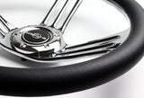 W-Power 14" 350mm 6-Bolt Hole Vintage Style Black Leather Grip With Aluminum Finished 3-Spoke 3 Inches Deep Dish Steering Wheel -Chrome Center Spoke