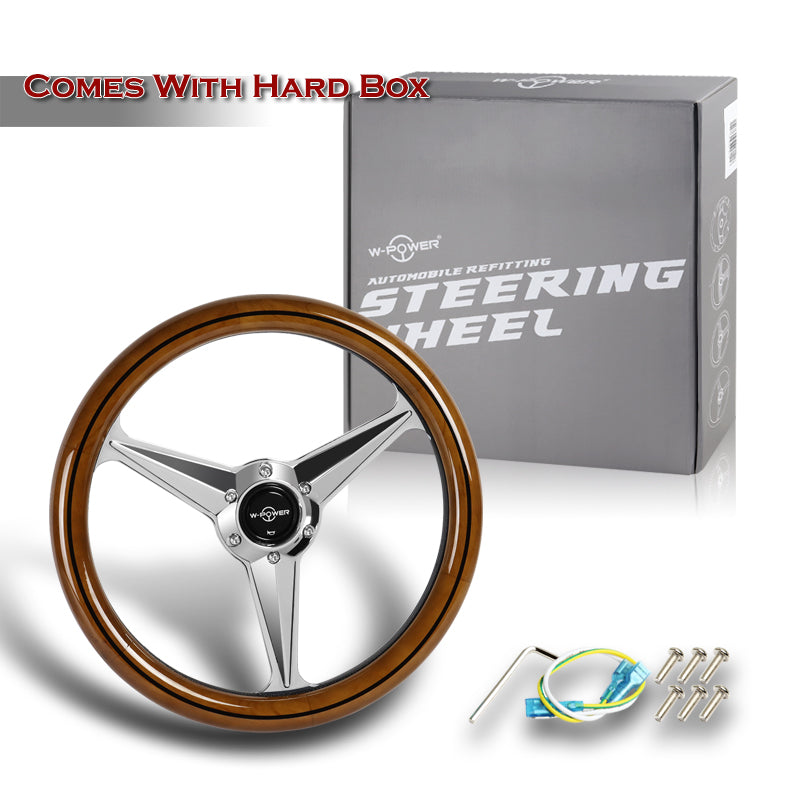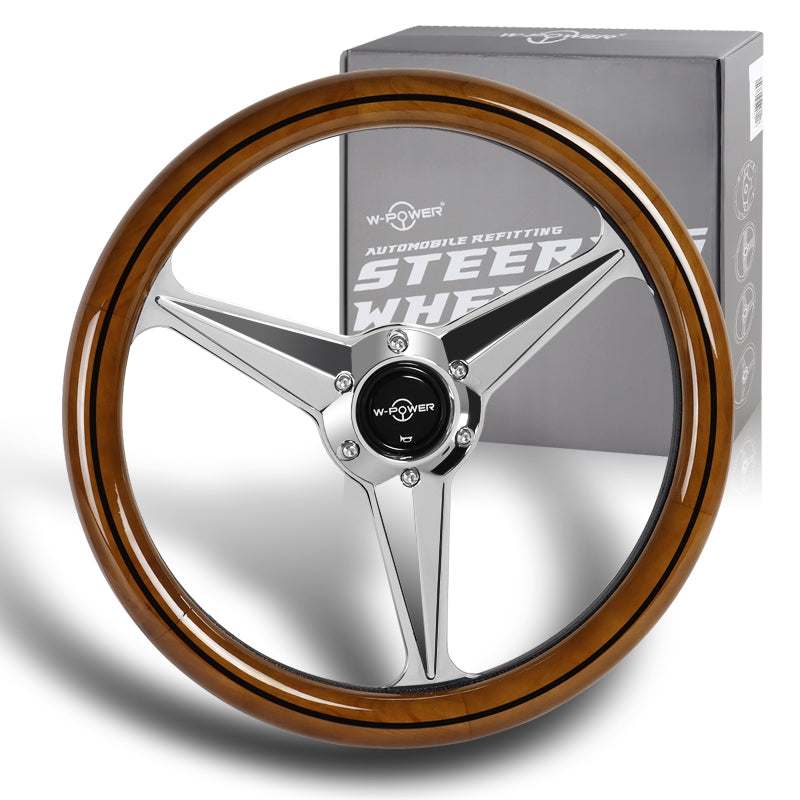 W-Power 14" 350mm 6-Bolt Hole Vintage Style Wood With Black Line Grip Aluminum Finished 3-Spoke Steering Wheel