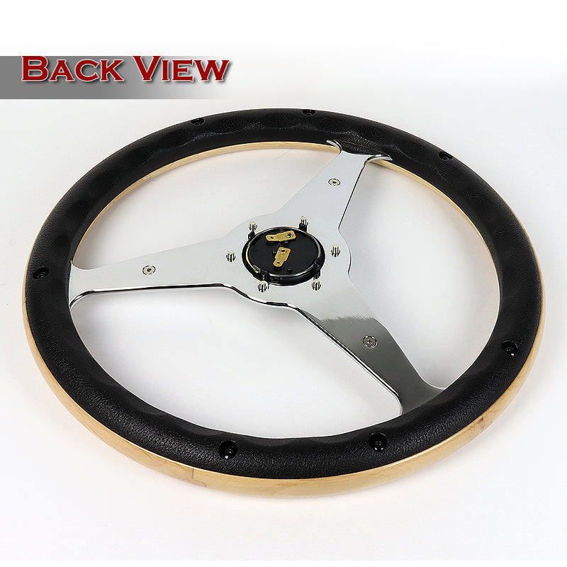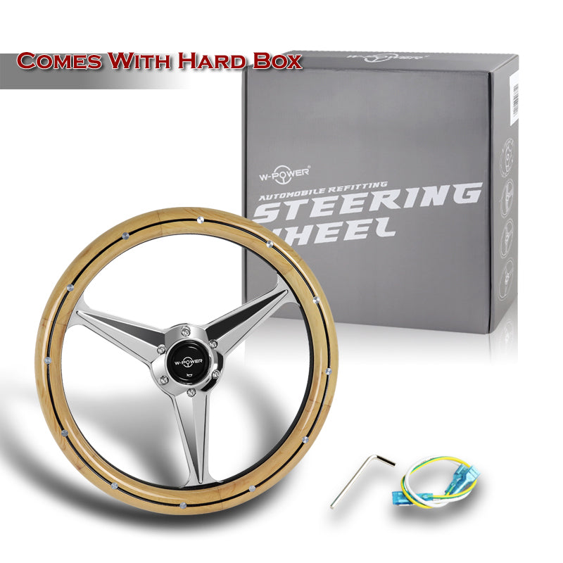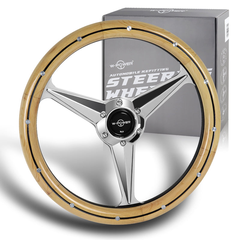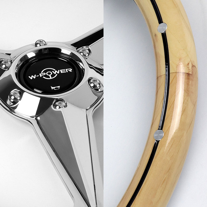 W-Power 14" 350mm 6-Bolt Hole Vintage Style Oak Wood With Billet Stripe Grip Aluminum Finished 3-Spoke Steering Wheel