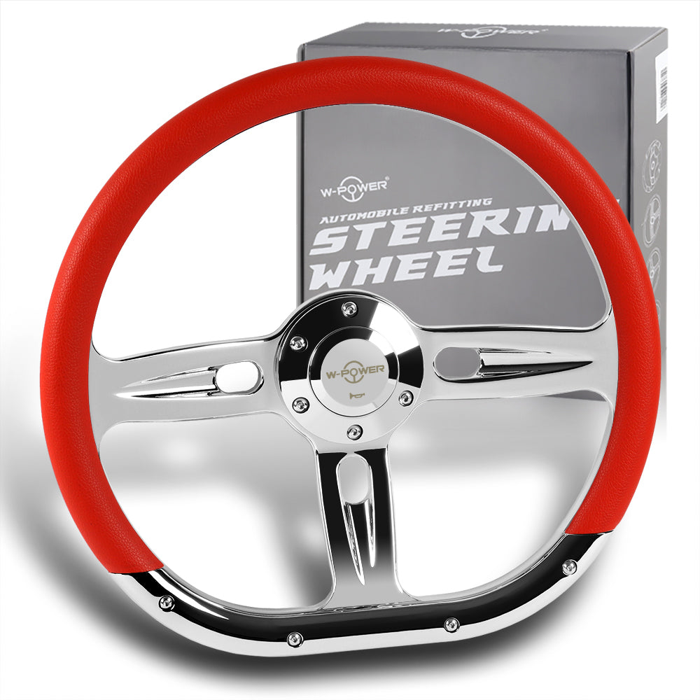 W-Power 14" 350mm 6-Bolt Hole Vinyl Grip With Aluminum Finished 3-Spoke Steering Wheel -Red Vinyl Wrap/Chrome Center Spoke