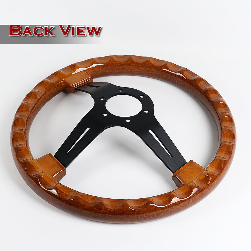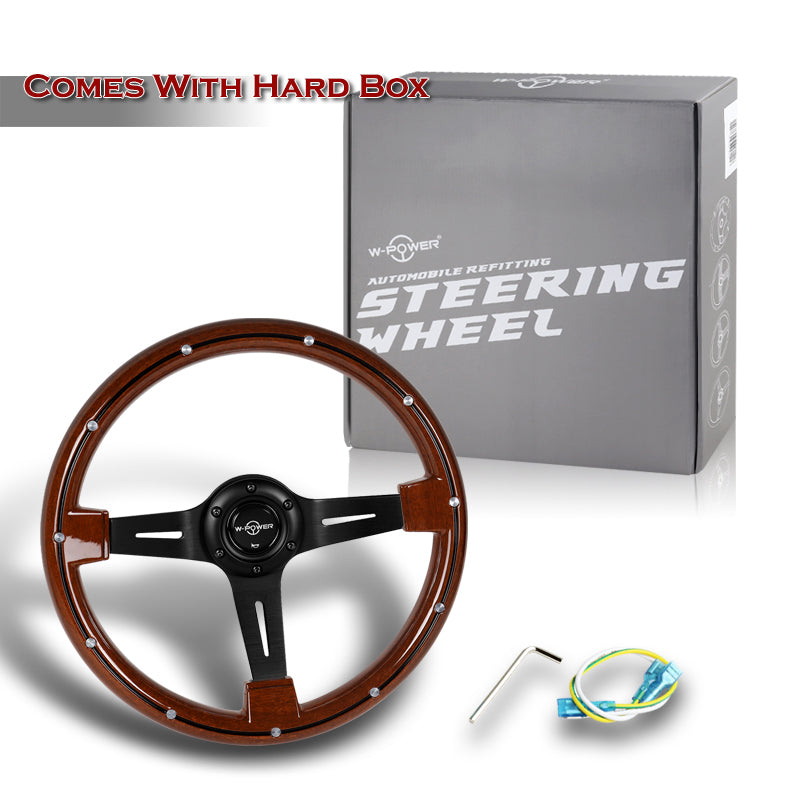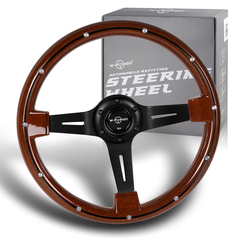 W-Power 14" 355mm 6-Bolt Hole Classic Style Galaxy Dark Wood Grain Grip With Aluminum Finished 3-Spoke 2.5 Inches Deep Dish Steering Wheel -Black Center Spoke