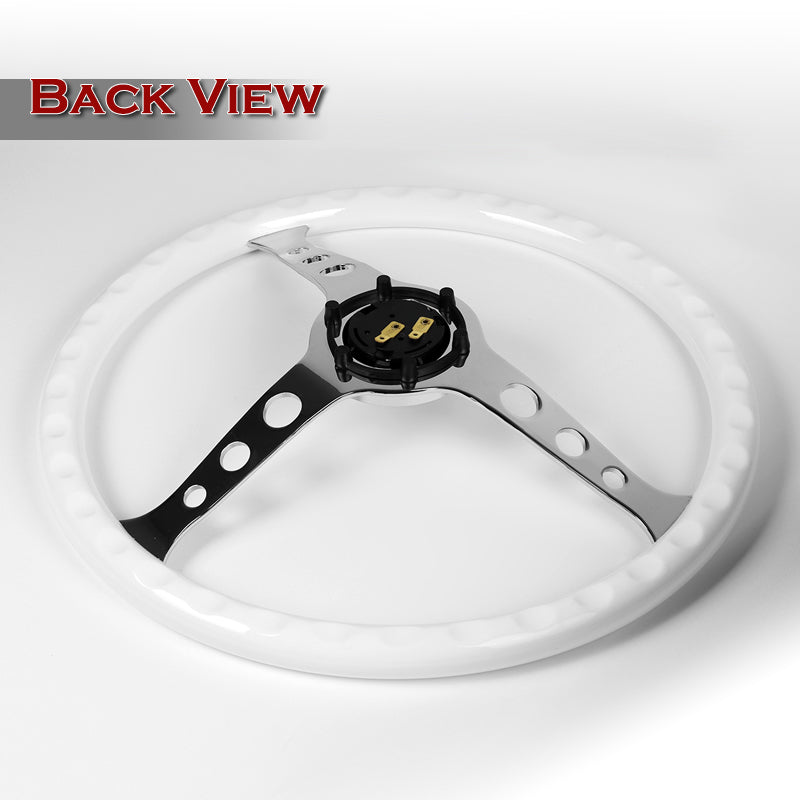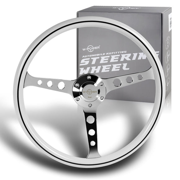 W-Power 15" 380mm 6-Bolt Hole JDM Euro VIP Style Classic Trim Grip With Aluminum Finished 3-Spoke 3 Inches Deep Dish Steering Wheel -White Wood Grain With Black Line/Chrome Center Spoke