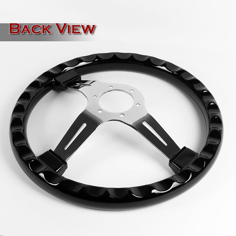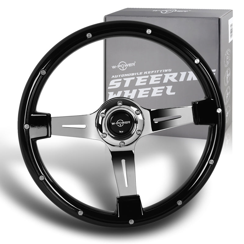 W-Power 14" 355mm 6-Bolt Hole Classic Style Galaxy Black Wood Grain Grip With Aluminum Finished 3-Spoke Steering Wheel -Chrome Center Spoke