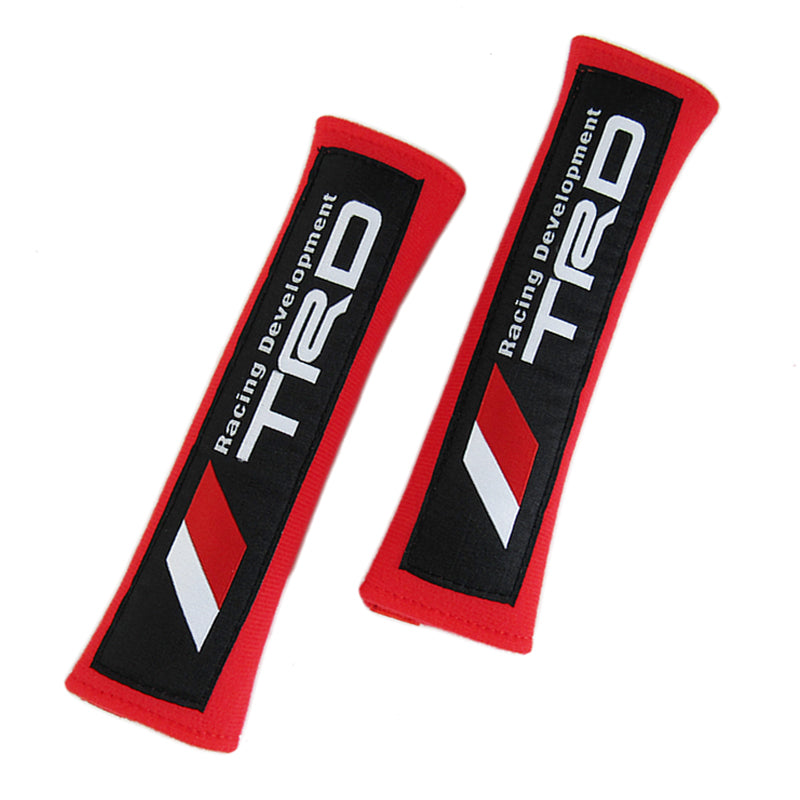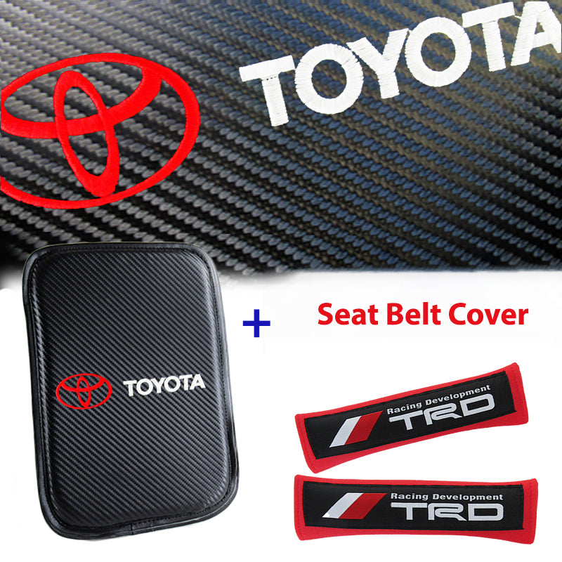 Toyota TRD Set of Carbon Fiber Look Embroidered Armrest Cushion & Soft Touch Cotton Material Seat Belt Covers New