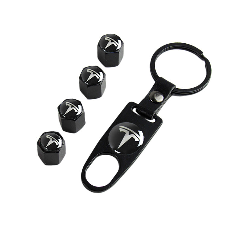 TESLA Set LOGO Emblems with Black Wheel Tire Valves Air Caps Keychain - US SELLER