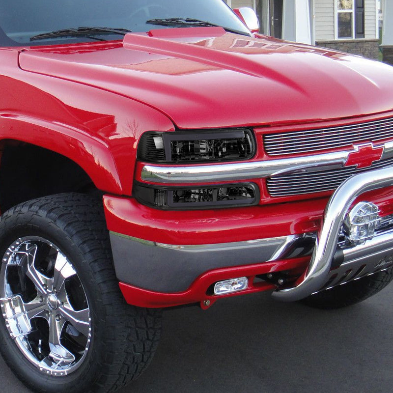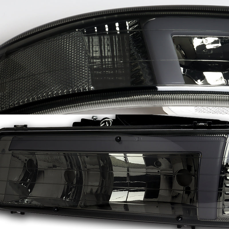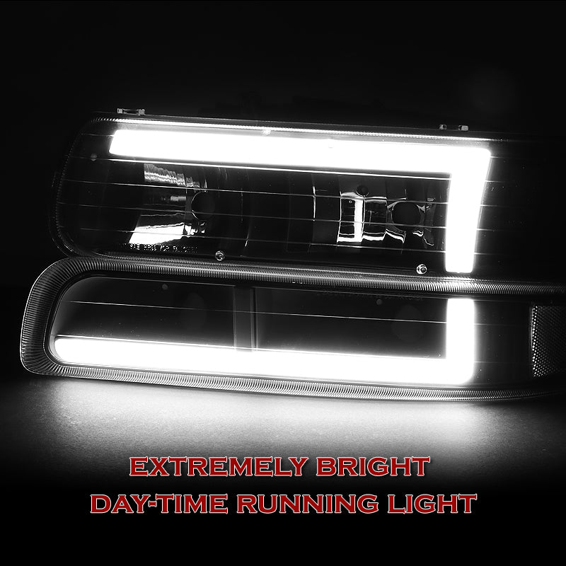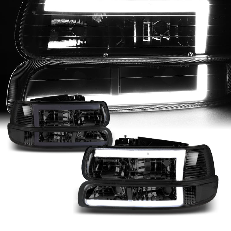 For 1999 - 2002 Chevrolet Chevy Silverado / 2000 - 2006 Tahoe Suburban LED Bar DRL Headlights -Chrome Housing / Smoke Lens / Clear Reflectors (4-Piece Set)